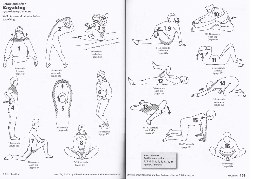 Stretch to the point where you feel tension and hold the position there. If you feel any pain -STOP. Stretching should not feel painful, don’t push your flexibility limits too far. Below is an illustration of relevant stretches (kayaking uses similar muscle groups and movements to outrigger paddling) from the Bon Anderson book.